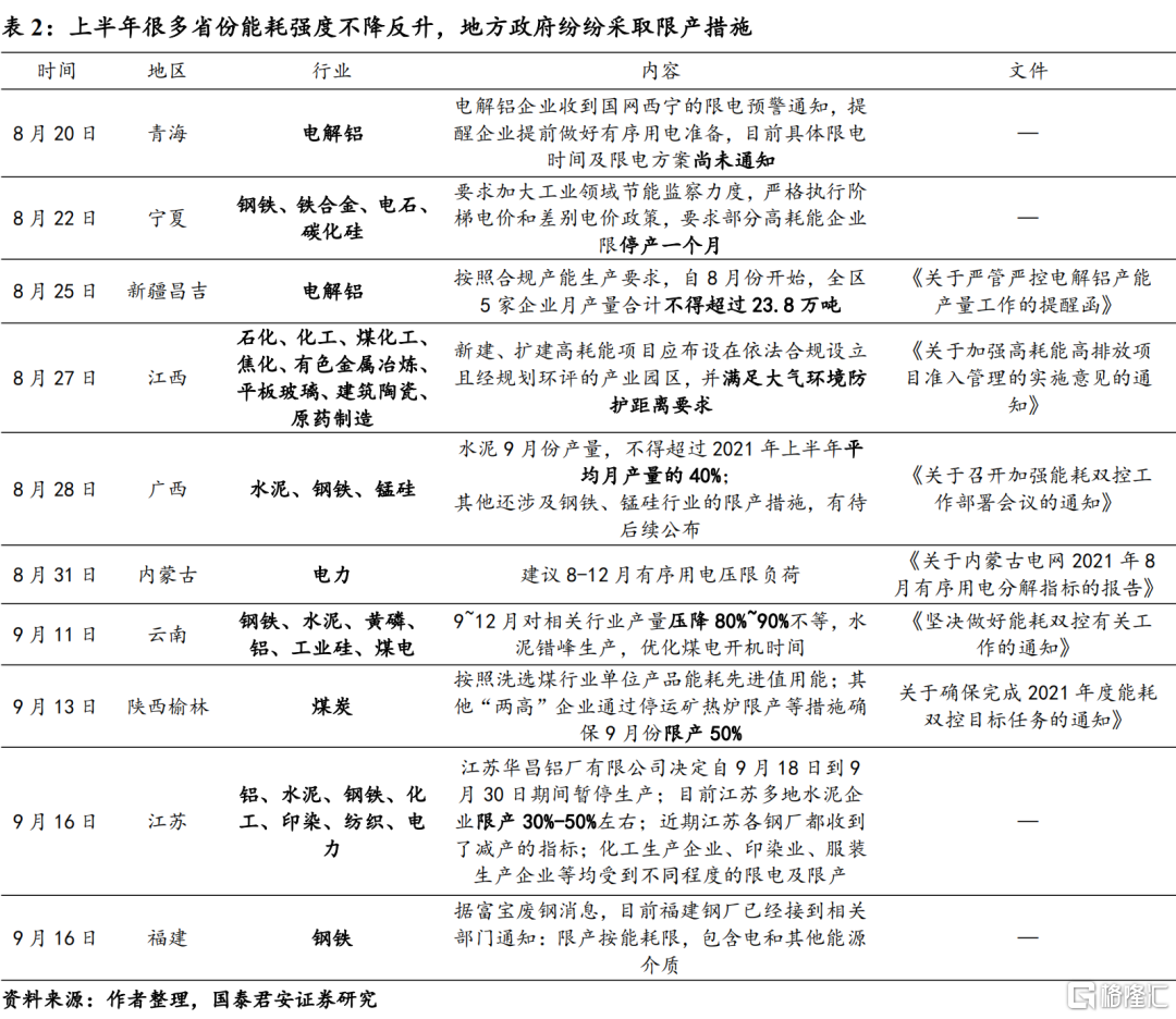 测算结果表明:若要完成全年的“双控”目标,在基准假设下,需要对一级预警的9个省份相关高耗能行业限产30%~70%,对于全国四季度GDP增速产生0.5%的持续拖累。相较于三季度,限产的力度将边际趋严,结合目前的各省的政策表态,多个省份尚未对限产的幅度进行规定,此外,二级预警地区的限产政策大多尚未出台。因此,为了达成全年的“双控”目标,需要各省共同发力,预计未来限产节奏不会发生大幅纠偏,相关省份在四季度将陆续出台相应的限产措施。