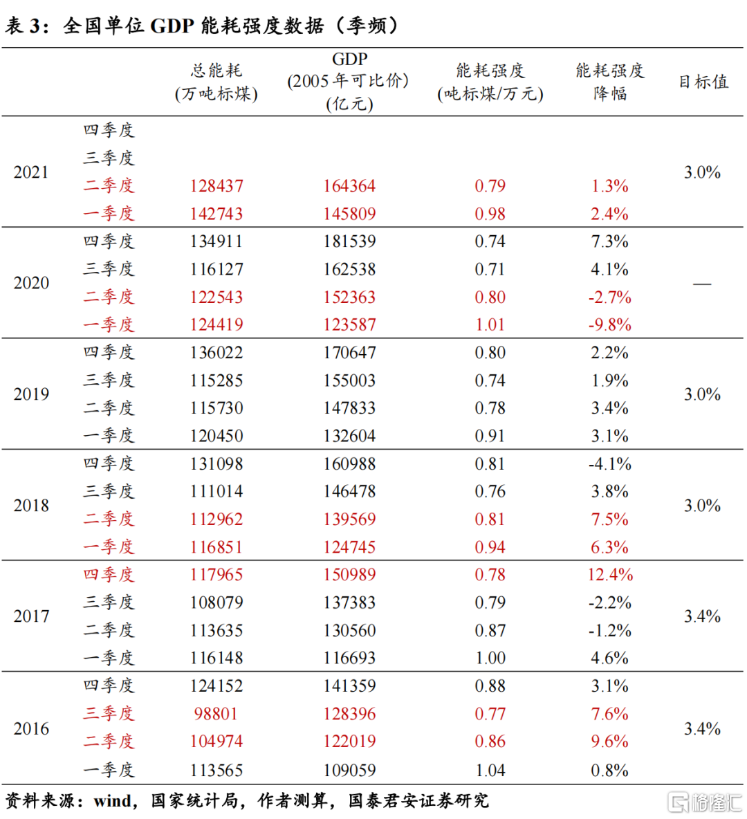 但从单独的年份来看,今年的能耗强度指标约束相对偏严。按照13.5%的五年目标来看,年均能耗强度大概需要下降2.56%,但国家发改委对我国今年能源强度制定3%的下降目标,总体来说还是较为严格。实际上,2019年并未完成当年制定的能耗目标(3%),主要是由于经济出现了显著下行(当年GDP增速6%),考虑到我国今年经济下行压力较大的情况下(我们预测今年GDP增速为5.2%),相较以往,3%的约束目标还是较为严格。此外,2020年由于新冠疫情,政府没有设定能耗指标,疫情过后的复苏打乱了整体的“双控”节奏,进一步增加了能耗指标达成的难度。