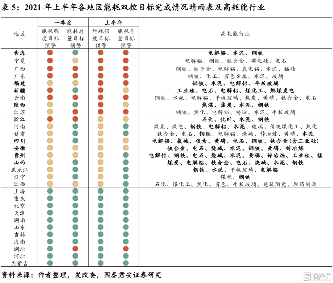 最后,今年的政策执行力度较往年大幅提升,中央容忍度下降,更加关注质量与结构问题。一方面体现在中央不断通过政策文件给地方政府施压,如:4月中旬的《关于加强高耗能、高排放项目生态环境源头防控的指导意见》、5月份的《关于进一步加强节能监察工作的通知》等;另一方面,发改委首次采用每个季度印发能耗晴雨表的方式来跟踪各省的能耗达标节奏,并对一级预警的省份采取约谈、暂停“双高”产能审批等措施,确保年内的“双控”目标顺利完成。