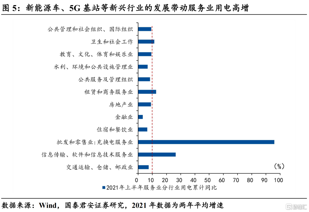 其次,上半年三产和居民用电高增与其GDP增速(居民活动不产生GDP)不成比例,总体上提升了我国的能耗强度。近几年5G基站、数据中心、新能源车的大力发展导致我国三产用电持续高增,今年上半年三产用电增速达到9.9%,与之不成比例的是上半年三产GDP同比仅为5.1%,说明三产的单位GDP能耗出现一定程度的上升。此外,上半年受疫情和高温影响导致的居民用电高增也对能耗强度产生一定的拖累。