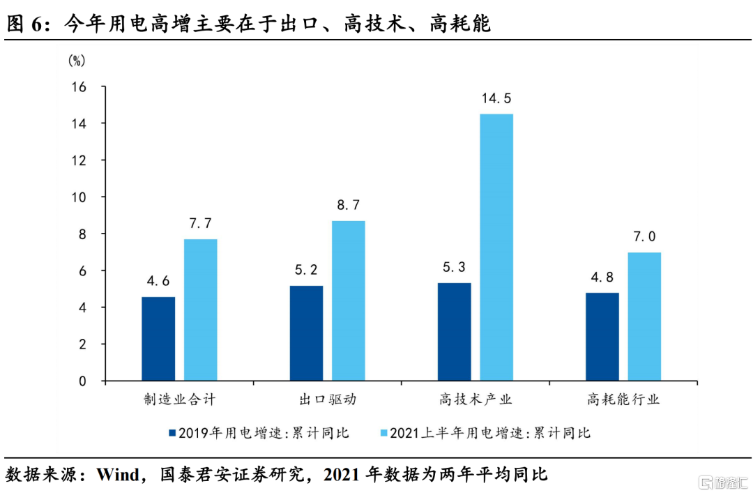 二产用电(总量):出口驱动、高技术制造业的用电增速大幅增长(8.7%和14.5%),此外上半年上游高景气度导致高耗能行业用电维持较高的增速(7.0%),对于能耗总量产生显著的拉升;