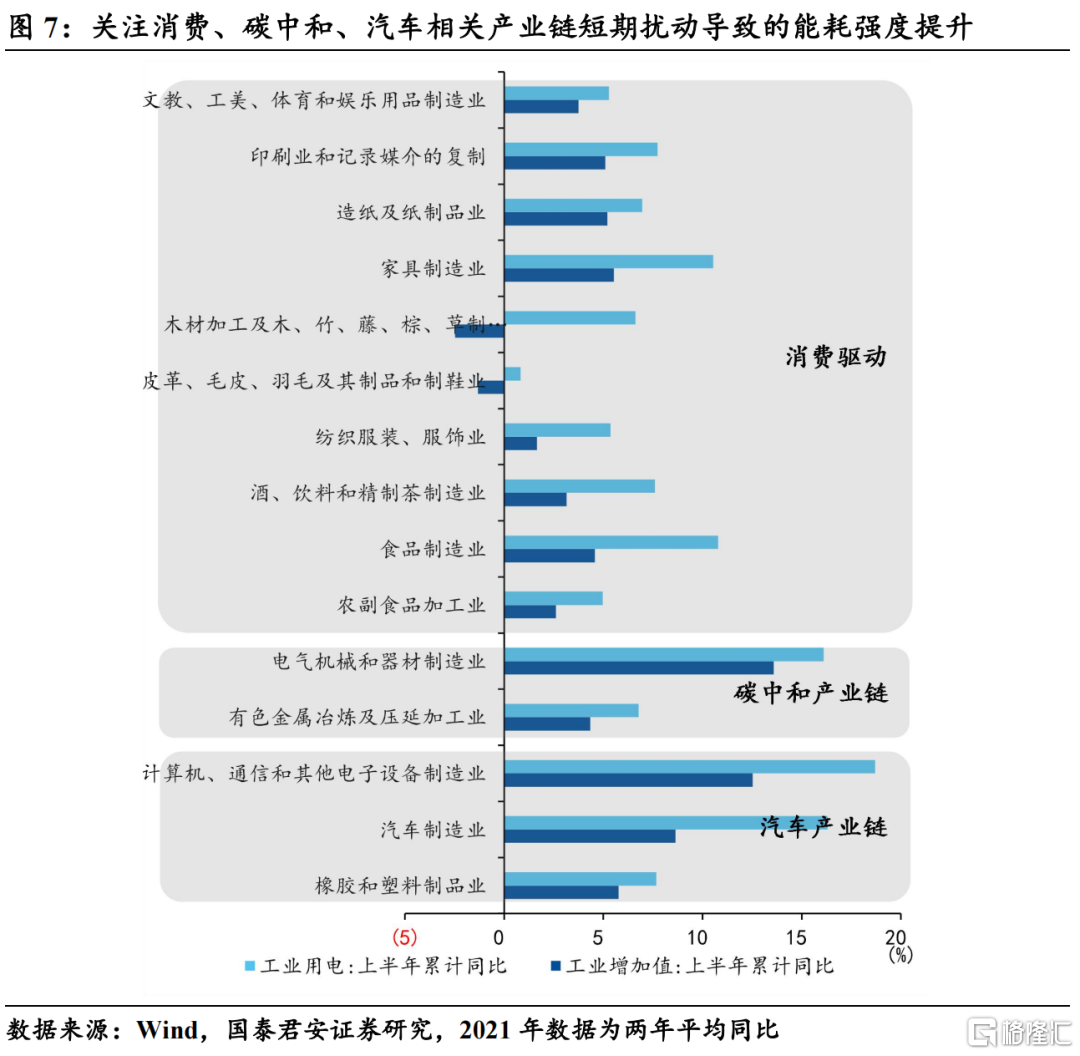 从能耗强度的角度来看,一方面高耗能行业的高增长对于上半年能耗强度大幅拉升,另一方面关注消费、碳中和、汽车相关产业链短期扰动导致的能耗强度提升。对比上半年分行业的工业增加值和用电增速,发现单位GDP能耗显著提升主要集中在两个方面: