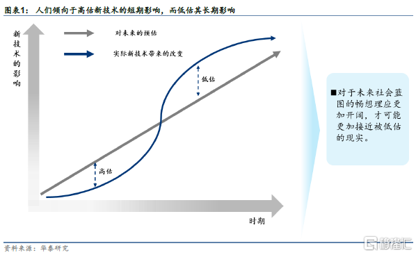 人们倾向于低估新技术的长期影响,开阔畅想才能更接近现实。根据阿玛拉定律,人们倾向于高估新技术的短期影响,而低估其长期影响。在思考面向2030年科技行业投资机会这个话题的时候,我们试图把对人类生活方式的变迁,人口老龄化,中美竞争等宏观层面因素的分析和人工智能,云计算,区块链,新能源等技术演进的分析相结合,以接近被低估的未来,发掘科技行业中长期的投资机会。