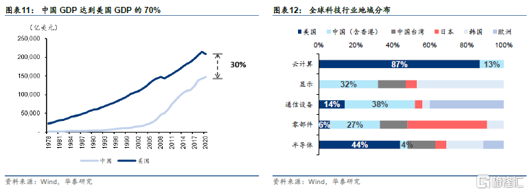 疫情与地缘政治对产业链的阻隔让中国企业和政府对全球价值链的重构认识更加深刻。2020年,中国GDP已经达到14.73万亿美元,是美国(20.93万亿美元)的70.4%。根据IMF预测,到2026年,中国在GDP上与美国差距有望缩小至12.8%,中美竞争预计成为新常态。在疫情与地缘政治的双重影响下,2020年5月14日,习总书记首次提出构建国内国际双循环相互促进的新发展格局。2021年3月11日, 十三届全国人大代表会上发布十四五规划和2035年愿景规划,明确硬科技科技自主创新国策。