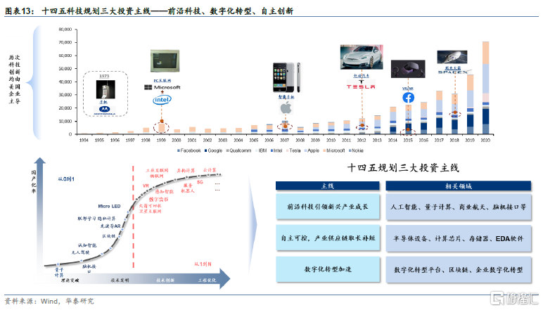 根据IMF预测,到2026年,中国在GDP上与美国差距有望缩小至12.8%,中美竞争预计成为新常态。半导体、基础软件等环节的短板和基础领域的创新不足是制约中国经济发展的瓶颈之一。习总书记在十四五规划和2035愿景规划中,明确提出硬科技补短板的同时,大力发展量子计算、脑科学、商业航天、人工智能等前沿科技领域。我们相信在科创板等利好政策和国产化新需求推动下,中国半导体和软件行业的发展将会从量变引发质变,到2030年前,逐步建成完整的半导体产业链和软件生态。在人工智能、量子计算、商业航天、生命科学等方向有望出现颠覆性创新。