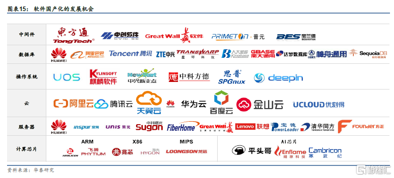 软件国产化的发展机会:从中间件、数据库、操作系统、云到服务器。国产化涉及硬件及软件等层次,从应用范围看,当前处于从党政试点进一步推广的阶段,从应用重心看,当前处于从“可用”向“好用”的进化阶段。我们认为,国产化终极形态或为包含软硬多个层次的生态系统,但考虑到国产软硬件产品的成熟度以及产能限制等因素,我们认为国产化推进的节奏将呈现逐步迭代的特点。而随着国内自主可控核心架构逐步建立,国内底层架构和上层应用生态有望逐步形成。在这一过程中,国产CPU、国产整机、国产操作系统、国产数据库、国产中间件、国产办公软件、国产安全保密产品、系统集成等领域均有望出现较好的投资机会。