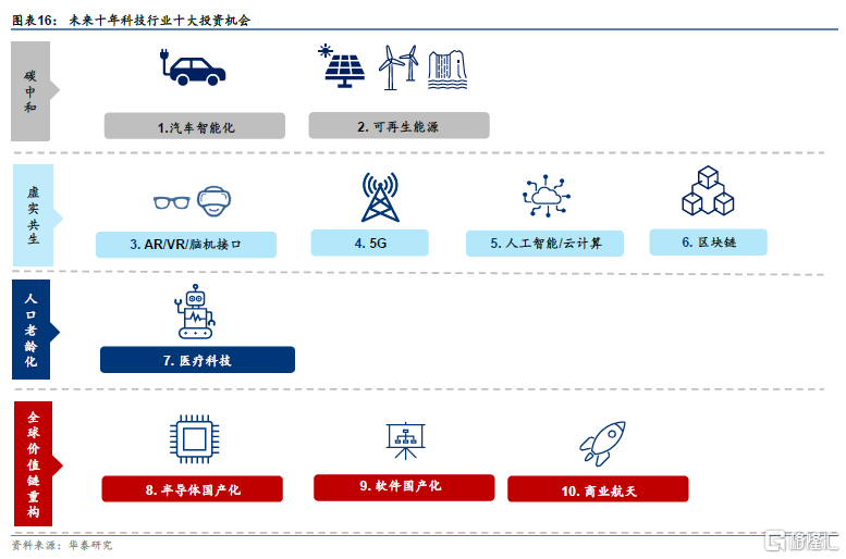 我们认为,到2030年,我们将生活在一个虚实共生,低碳绿色,和自主创新的社会。人口老龄化成为虽然对制造业等传统行业造成冲击,但是也会促进无人技术和脑机接口等医疗科技的发展。在这样的新型社会中,我们看好汽车智能化,可再生能源、AR/VR/脑机接口、5G、人工智能/云计算、区块链、医疗科技、半导体国产化、软件国产化、商业航天十大投资方向会涌现出丰富的投资机会。
