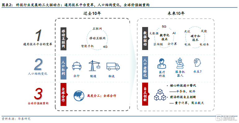 我们认为,通用技术平台的变化,人口结构的变化,以及全球价值链重构是推动中国科技行业发展的三大动力。人工智能,云计算,区块链等数字化技术,以及锂电池,光伏,风电等碳中和技术将取代移动互联网成为新的通用技术平台。中国人口在未来十年可能进入零增长或者负增长时代,无人技术和医疗科技有望实现高速增长。在中美竞争的大背景下,半导体,基础软件等过去依赖美国供应链的行业的国产化有望大幅提升,中国对基础研究的大规模投入,有可能在量子计算,脑科学等前沿领域出现0到1的颠覆式创新。