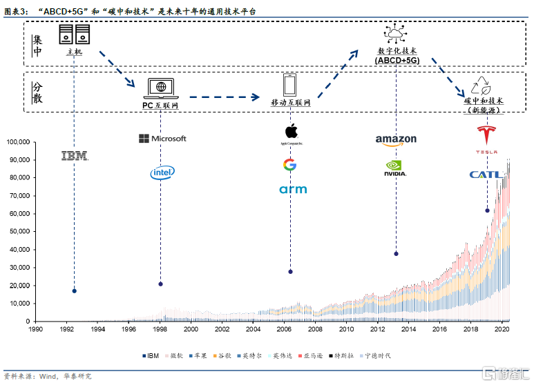 每次技术的变革都包括一批重要的平台型企业的崛起。这包括主机时代的IBM,PC互联网时代的微软和Intel(Wintel联盟),移动互联网时代的苹果、ARM、谷歌,AI云计算时代的亚马逊、微软和英伟达,和碳中和时代的特斯拉和宁德时代。