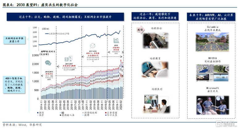 疫情催化虚拟应用加速渗透,元宇宙最初级场景初露头角。过去一年,疫情期间保持安全的“社交距离”,大量企业在未充分准备的情形下被迫选择远程办公实践,催化企业数字化转型也加速落地,同样,远程医疗和远程教育等应用场景持续加速渗透,改变了人们的生活习惯,数字化服务的接受程度不断提高。但我们认为这些都只是元宇宙的最初级场景。