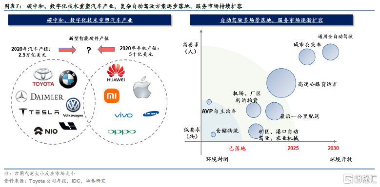 手机和汽车是全球两大主要消费品品类,全球市场容量合计约20万亿人民币。在碳中和相关政策推动下,全球新销售乘用车的电动化率到2030年有望超过40%。电动化大幅度简化了汽车结构,为智能化提供了更好的发展平台。从结构和供应链上看,汽车开始向手机趋同。我们认为,汽车与手机行业将逐渐融合,有望到2030年在全球形成一个新的智能硬件市场。我们看好(1)品牌融合淘汰过程中硬件军备竞赛的受益者,以及(2)自动驾驶出租车(RoboTaxi),自动驾驶卡车(RoboTruck)等出行服务市场的发展机会。