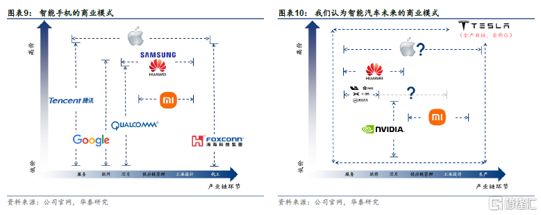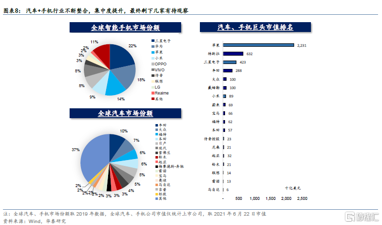 汽车+手机行业行业长期将整合,十年后还能剩下几家?手机行业从功能机向智能手机的转换,也是行业整合和洗牌的十年。行业从初期的“百花齐放”,最终整合为5-6家头部厂商的竞争格局。而目前,汽车行业的市场相对分散,最大的厂商的市场份额仅为约10%。最近几年,又有蔚来,理想,小鹏等造车新势力,以及小米等手机厂商纷纷加入。参考手机行业的经验,我们认为这个新的智能硬件行业也会从初期的百花齐放,走向整合淘汰。长期来看,能剩下几家有待观察。