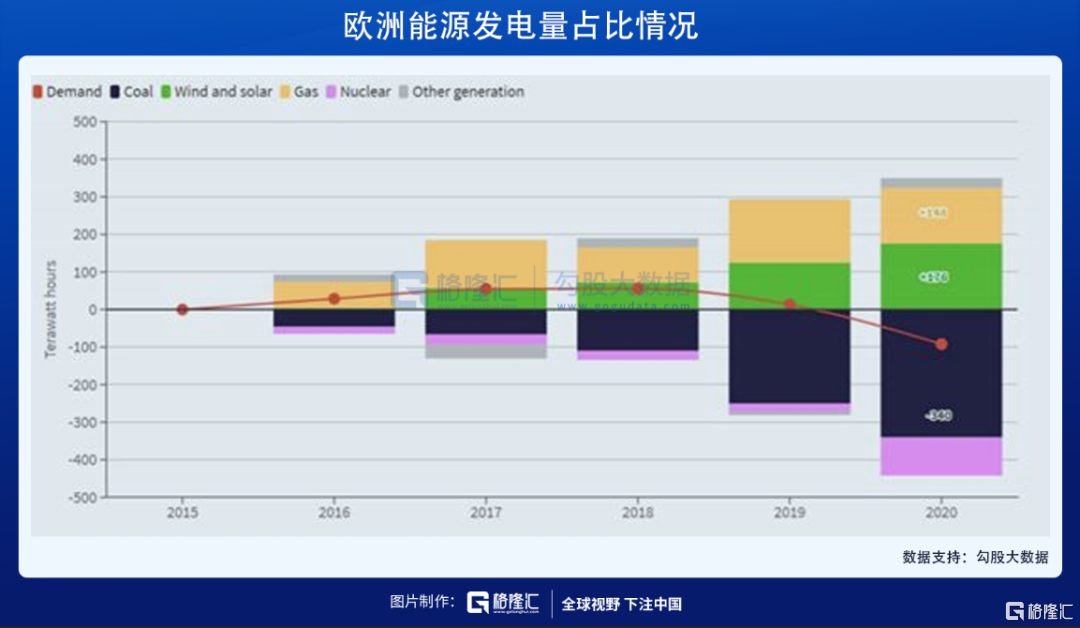 数据显示,2020年,欧洲煤炭发电量占发电总量的13%,占比下降了20%,是2015年的一半。其中一半由太阳能和风电填补(176 TWh),另一半则由天然气取代。