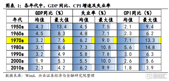 横向对比来看,“滞”与“胀”成为当时美国经济的两大关键词,低增长、高失业、高通胀是常态。1)低增长:1970年后美国经济扩张速度较过去20年明显放缓,GDP同比由4.5%边际降低至3.2%。尤其是,十年间美国经济增速三次跌入负区间,更是历史上从未有过的现象。2)高失业:70年代失业率较60年代显著攀升,十年间失业率从未低于5%,平均失业率达6.2%,仅次于80年代(80年代失业率激增主要受初期沃克治理恶性通胀,货币环境剧烈收紧、联邦基准利率升至20%以上、美国经济“W”形衰退的影响)。3)高通胀:70年代的通货膨胀水平为二战后来最高,10年间仅有3个月的CPI同比低于3%,平均CPI高达7.1%,较60年代上涨近5%。