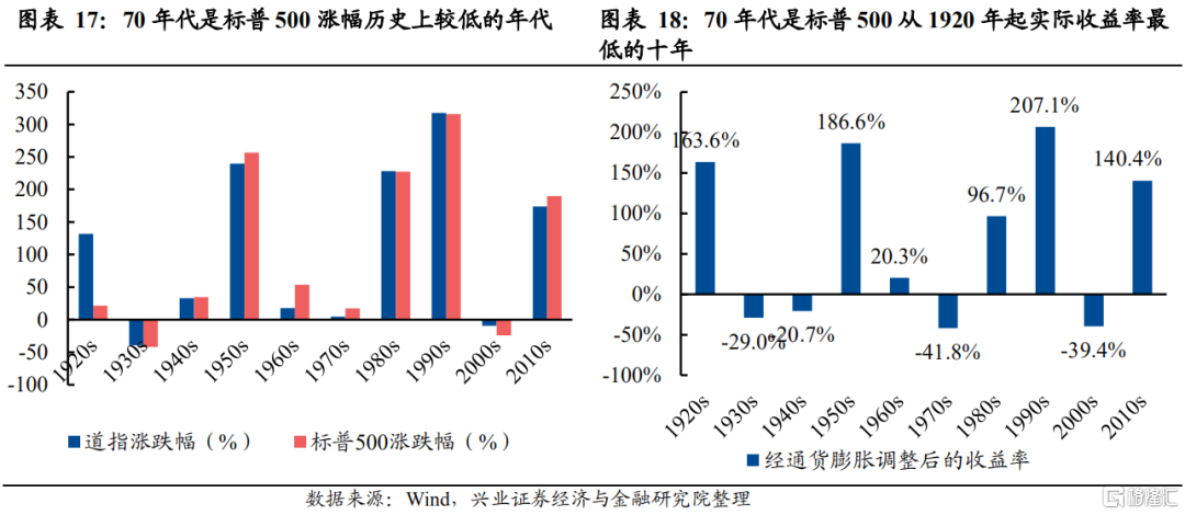 70年代的美股是1920年以来最差的年代。截止1979年12月31日,道指上涨4.8%,标普500上涨17.2%,70年代美股涨幅为1930s以来第三低,其累计涨幅仅高于包含大萧条时期的1930s年代和包含次贷危机的2000s年代。此外,如果考虑剔除通货膨胀后的实际收益率的话,70年代标普500的真实收益率为亏损41.8%,是1920年以来美股最差的十年。