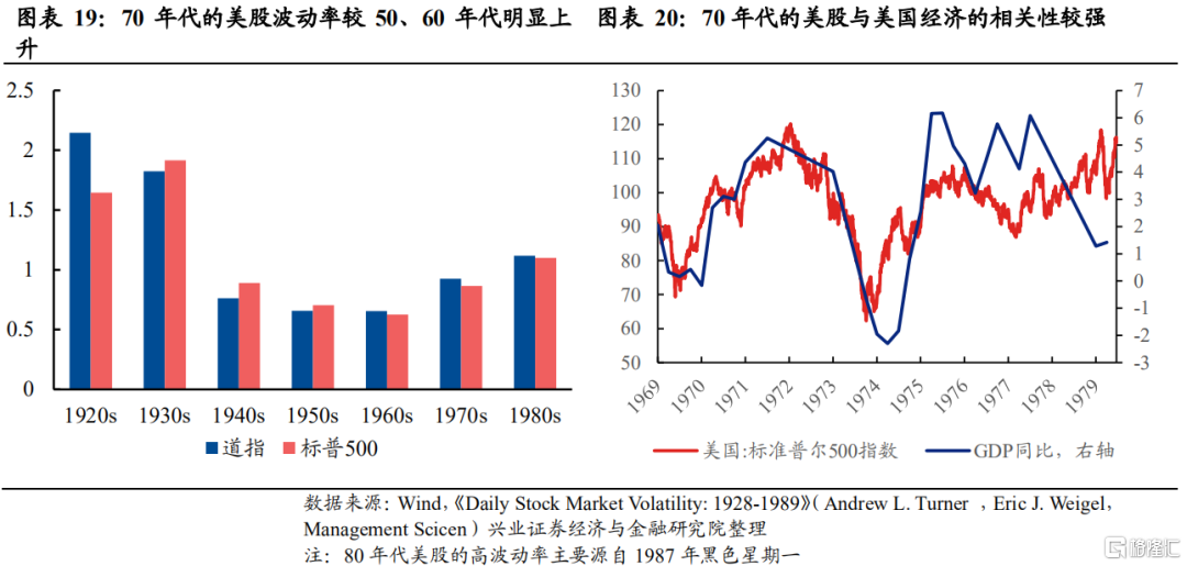 受经济周期影响,70年代美股剧烈波动,市场整体呈N型走势。该时期的美股走势震荡,波动率大幅上升。根据Andrew L. Turner 和 Eric J.Weigel的测算,截至1979年底,道指(标普500)的标准差为0.93%(0.86%),显著高于50和60年代的波动率水平。我们可以看到该时期美股与经济美国的周期存在非常明显的相关性,所以频繁变动的经济周期使美股的波动较为剧烈。