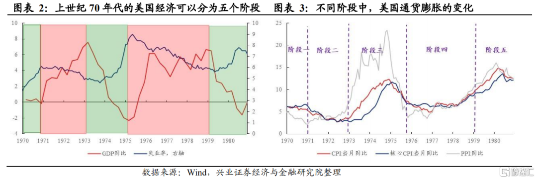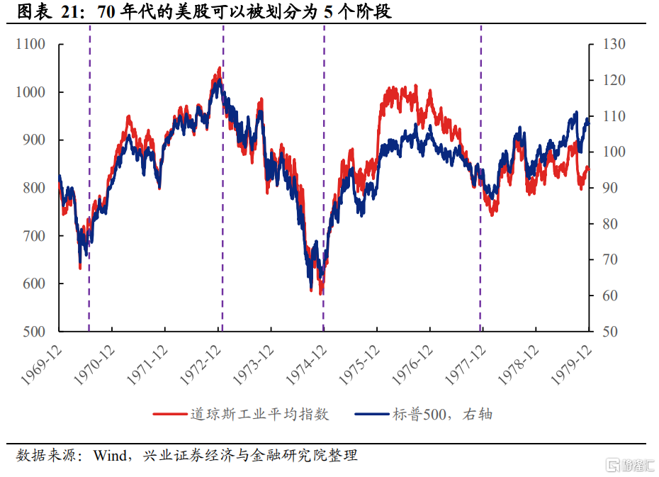 具体来看,根据市场周期和经济周期,我们可以将70年代一波三折的美股划分为五个阶段: