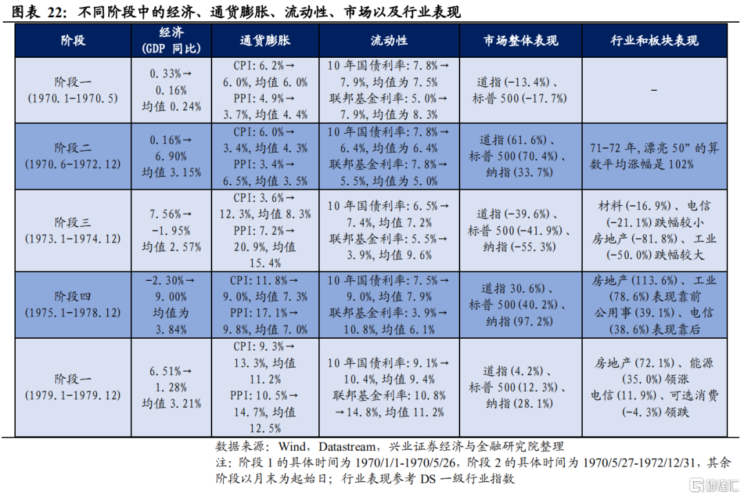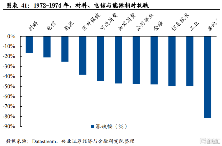 阶段3:1973-1974年,通货膨胀程度加剧,美股快速走熊,道指与标普500跌幅在40%左右;材料、电信与能源行业相对抗跌,房地产与工业板块表现靠后。