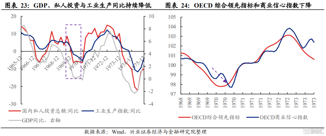 (1)1970Q1-1970Q4,GDP增速跌至-0.17%,失业率上行2.6pct至6.1%;尽管需求萎缩使CPI同比减少0.6%,但通胀整体仍处于6%以上的高位,大宗商品价格可控,PPI同比由4.9%走弱至2.2%。