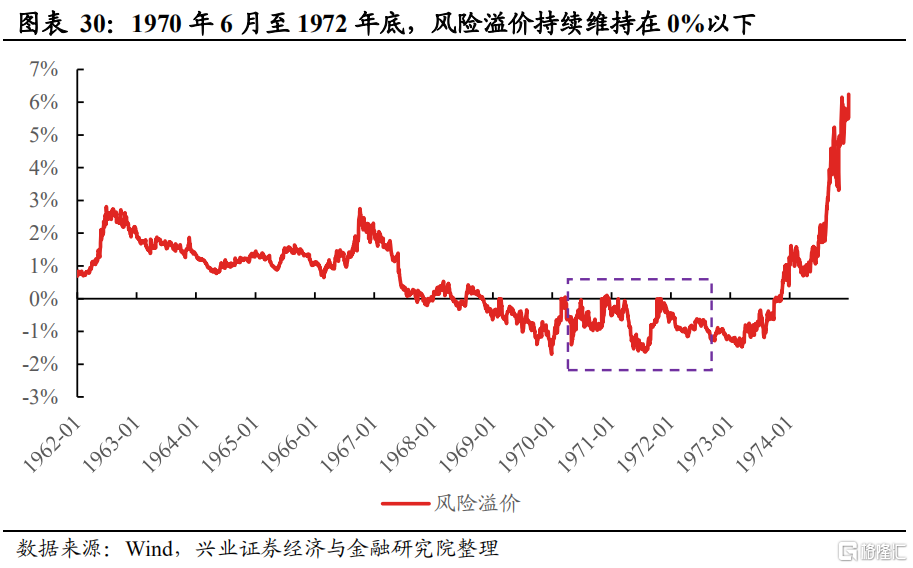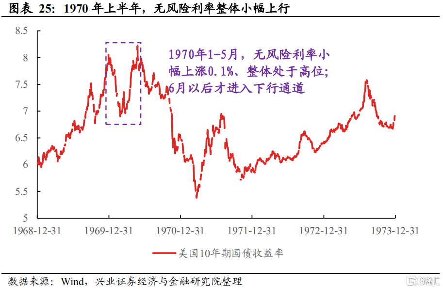 流动性:持续的高通胀使市场对美联储的宽松政策“不买账”,无风险利率持续处于高位。实际上,1970年2月1日,伯南克就任之后就将货币政策的目标函数由“抗通胀”转为“抗衰退”,有效联邦基金利率呈下降趋势,但10年期国债利率仅在2月有短暂的降低,之后,由于CPI同比仍处于6%左右的高位,市场的通胀预期使10年期国债利率再次上涨。拉长来看,截至5月23日,无风险利率由7.9%小幅上涨至8%,也就是说美联储所释放的流动性并未使市场利率接受,该时期无风险利率更多地是受通胀预期干扰。所以我们可以看到,当1970年6月随着CPI同比确认向下的拐点后,10年期国债收益率才进入下行通道。