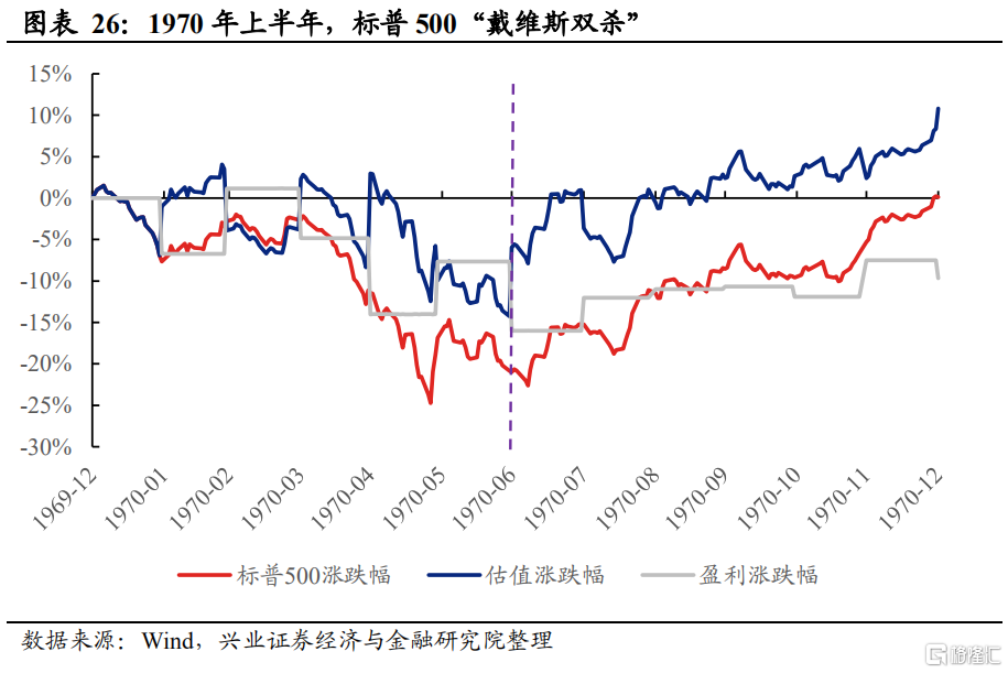 1970年上半年,经济陷入衰退,叠加无风险利率持续处于高位,市场延续了1969年的颓势,截至1970年5月底,道指与标普500的跌幅均在20%以上。从驱动力来看,该阶段美股“戴维斯双杀”,标普500估值下跌12.5%,拖累指数下行11.6%,盈利减少14%,拖累指数下行13.1%。