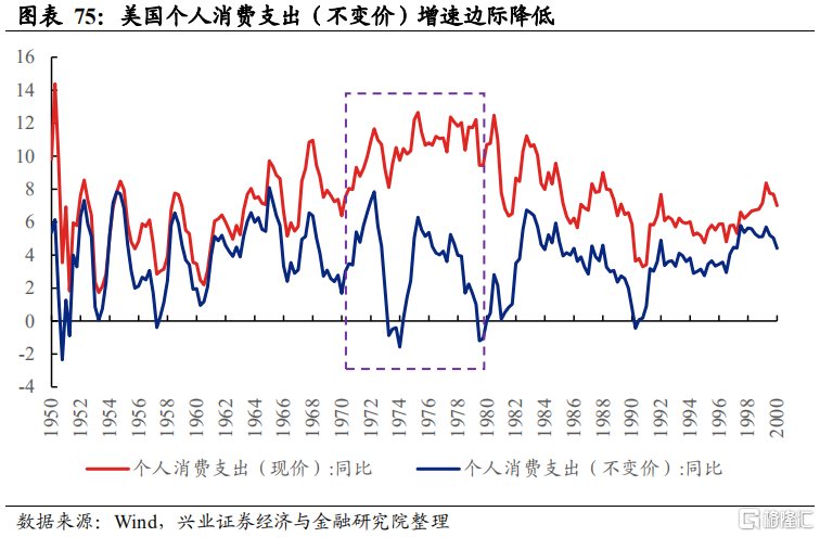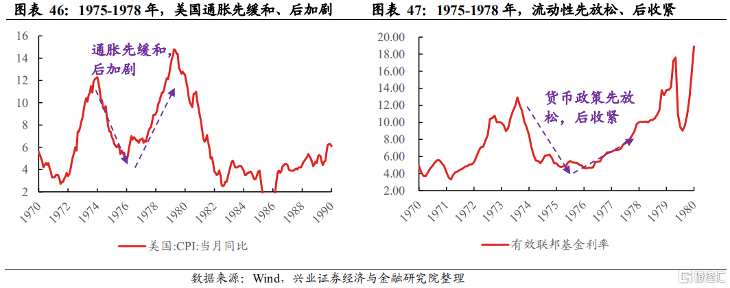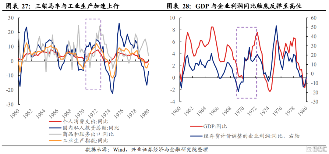 (2)1971Q1-1973Q1,经济增速快速反弹至7.56%的高位,失业率缓慢下行0.9pct;CPI同比持续降低1%左右,但4.6%的绝对值仍旧指向高通胀,此外,PPI同比涨幅达7.7个百分点,意味着工业品市场价格快速升温。