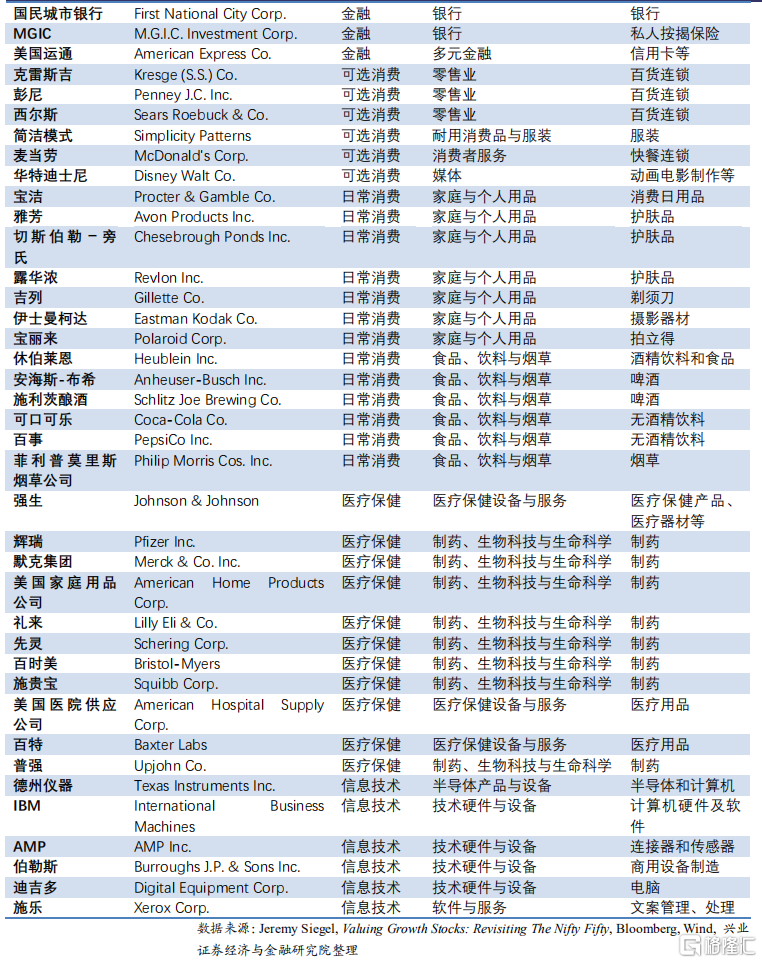 结合Jeremy Siegel的《Valuing Growth Stocks: Revisiting The Nifty Fifty》,我们首先整理出“漂亮50”的个股名单。从行业分布看,“漂亮50”的公司主要分布在消费、医药和信息技术等第三行业,日常消费、可选消费、医疗和信息技术个数分别为13、11、6、6家,四个行业个数占比超过70%。