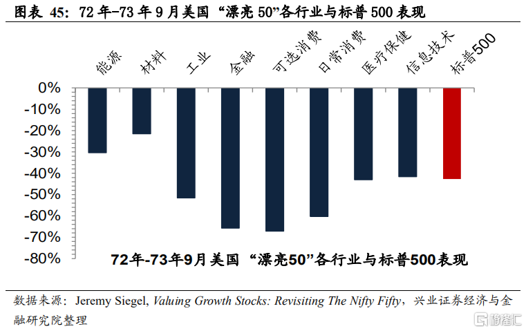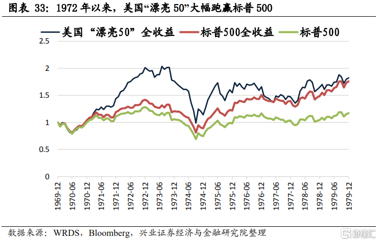 值得一提的是,在流动性大幅收紧、市场“杀估值”的背景下,前期被严重高估、泡沫最严重的“漂亮50”下跌最惨。从72年底市场高点到74年9月市场低点,美国“漂亮50”组合50只股票的算数平均跌幅是50%,同期标普500全收益指数下跌43%。