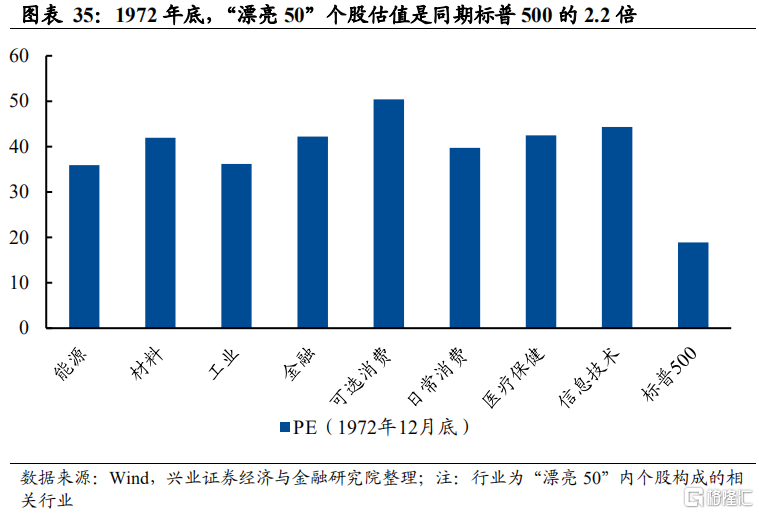 讽刺的是,后期,市场投资大盘蓝筹股的逻辑由理性逐渐转变为盲目,资金的无脑涌入助涨“漂亮50”估值飙升。彼时的投资者对“漂亮50”产生“过度投资”,他们认为这些公司业绩如此之好,付出任何代价都无所谓,股价的一路飙升总会让你获得巨大的收益,于是资金持续涌入“漂亮50”个股。截至1972年年底,美国“漂亮50”平均PE达到了41.5倍,而同期标普500的PE仅19倍出头,美国“漂亮50”平均PE是标普500的2.2倍。