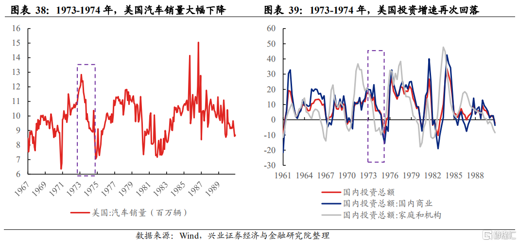 基本面:1973年以来的通货膨胀不仅导致无风险利率上升,同样也对美国经济造成了不可磨灭的负面影响, GDP同比由高点单边下行至1975Q2的-2.3%,失业率加速上涨至9%。具体来看,(1)通胀对消费的挫伤最为严重,居民消费意愿和能力的降低使个人消费支出(不变价)增速从7.6%在两年的时间内直线下滑至-1.6%,其中对原油价格敏感的汽车消费下滑尤为严重,美国汽车销量从1200万辆减少40%至720万辆;(2)通胀引发的高利率环境既降增加融资成本,又降低了实际的投资回报率,使美国私人投资水平也有一个明显的回落。