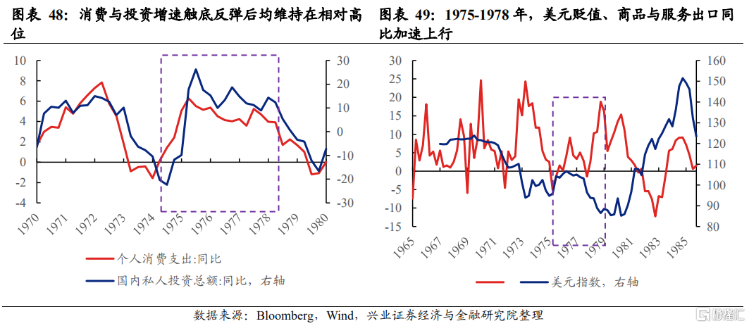 基本面:石油危机结束后,强劲的企业投资和居民消费,叠加美元贬值带动的出口,三架马车共同支撑美国经济触底回升后维持高速增长。投资方面,随着流动性边际增加,尤其是美联储多次调整商业银行最优惠贷款利率,融资成本降低催化投资走高,美国私人投资总额增速由-23.4%回升至26.3%,此后持续保持在10%以上的高位,其对GDP同比增长的拉动平均在1.2%左右;消费方面,受《1975年减税法案》刺激,叠加通胀向下、收入向上,消费最先开始复苏,美国个人消费支出同比快速反弹并整体维持在4%以上的高位,其对GDP同比增长的拉动平均在2.5%左右;出口方面,受益于全球需求复苏(OECD:G7的工业生产指数由50升至60)以及美元贬值(美元指数由97.3降至86.5),美国出口金额增速由3.1%升至18.8%。