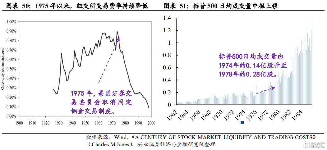 (1)1975年,美国证券交易委员会取消了固定交易佣金制度,开启了允许浮动佣金制度的新时代,据Charles M.Jones 测算,1975年以来,纽交所交易费率从1%一路直线下行至0.1%以下,佣金率的降低在一定程度上刺激了投资者入市,为市场带来了“活水“,标普500成交量由1974年的1400万股中枢上移至1978年的2800万股。