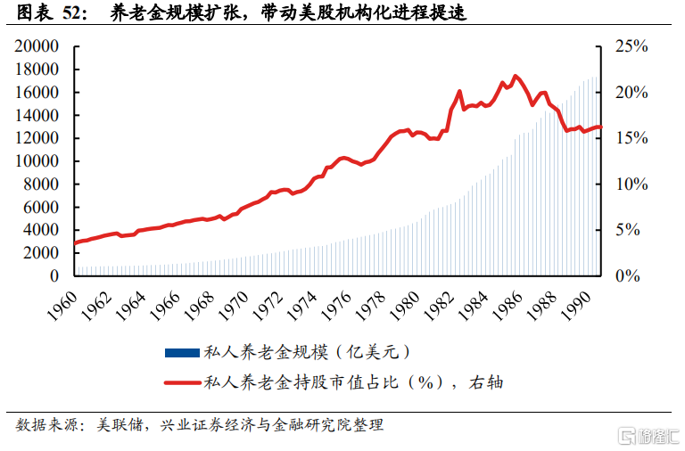 (2)1974年美国政府颁布实施了《雇员退休收入保障法》(ERISA),将原来企业养老保险“现收现付制”改为独立于企业雇主资产的“基金制”,同时为了降低企业雇员养老金损失的风险,美国政府要求企业雇主向联邦政府成立的养老金担保公司(PBGC)缴纳保险费,另外,该法案还历史性地提出了个人养老金账户(IRA)的概念。1978年,美国国内税收法第401条新增第(K)项,该条款给予了雇主和雇员双方税收优惠,大大激发了两方建立和参与雇主养老金计划的积极性。IRA计划和401(K)计划的出现加速了美国养老金规模扩张,有利于美股机构化进程提速。截至1978年底,私人养老金规模上涨超50%至4130亿美元,其持有的美股市值占比增长3.7pct至15.5%。养老金这类偏好价值投资的长钱入市有利于与股市上涨形成正循环,1978 年创设401(k)条款之后的半年,股市上涨至阶段性高点。