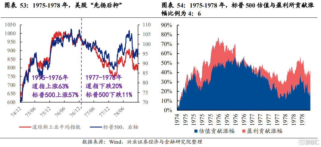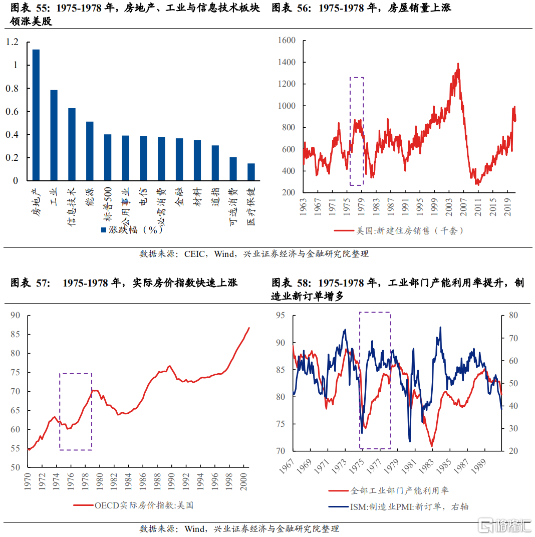 阶段4:1975-1978年,基本面复苏并维持繁荣,流动性先松后紧,美股“先扬后抑”,道指与标普500累计上涨30%和40%;房地产、工业与信息技术业领涨。
