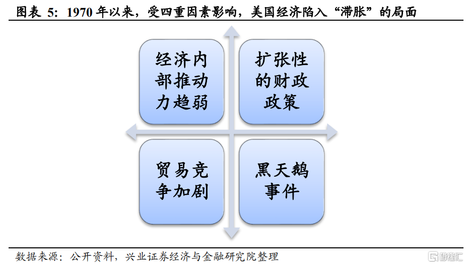 20世纪70年代,美国的滞胀现象可以归咎于四方面因素:1)匮乏内生经济增长的动力;2)日德崛起导致贸易竞争加剧;3)政府持续扩大财政开支;4)两次石油危机等黑天鹅事件。