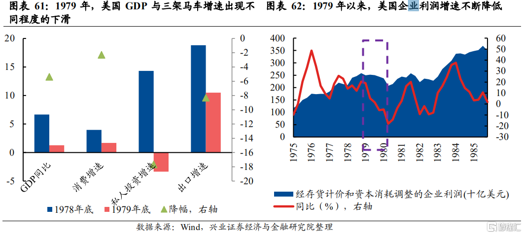 基本面:高通胀遏止宏观经济和微观企业盈利增速。宏观视角下,美国GDP同比由从6%以上的高增速逐步递减至1.3%、个人消费支出增速累计下滑2.3pct、国内私人投资更是于1979Q4萎缩至负增长、出口增速由18.8%降至10.5%;微观视角下,1979年,美国企业利润(经存货价和资本消耗调整)的四个季度的增速分别是19%、5.2%、1.6%和-5.6%,代表了不断边际降低的盈利增速。