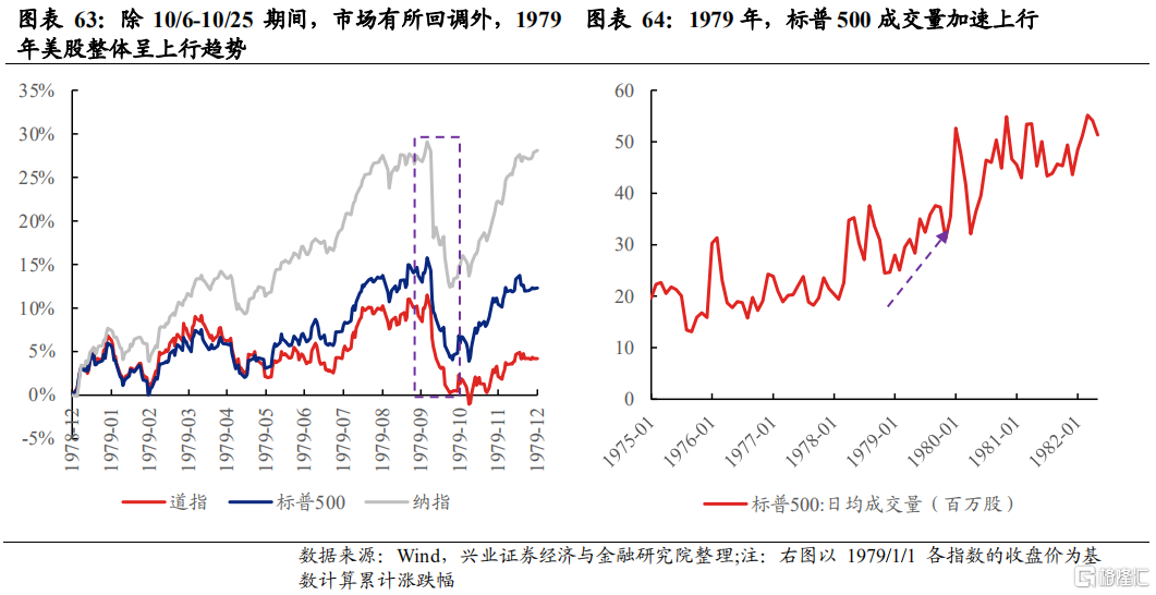 1979年,尽管分子端基本面衰退,叠加分母端无风险利率走高,但市场却走出一轮小牛市,道指、标普500及纳指全年涨幅为4.2%、12.3%、28.1%。从驱动力来看,根据DDM模型,当盈利与估值同时向下的时候,美股上涨的动力只有可能来自市场风险偏好和情绪的提升,事实上我们也能看到1979年标普500成交量加速上行。我们认为沃克尔上台前,10年期国债收益率表征的流动性未边际降低对市场来说就是好消息;沃克尔10月6号发言后,鹰派货币政策短暂地使估值和美股回调,但之后不久,出于对美联储新任主席能够抑制长达10年的通货膨胀的信心,市场风险偏好再次回升。