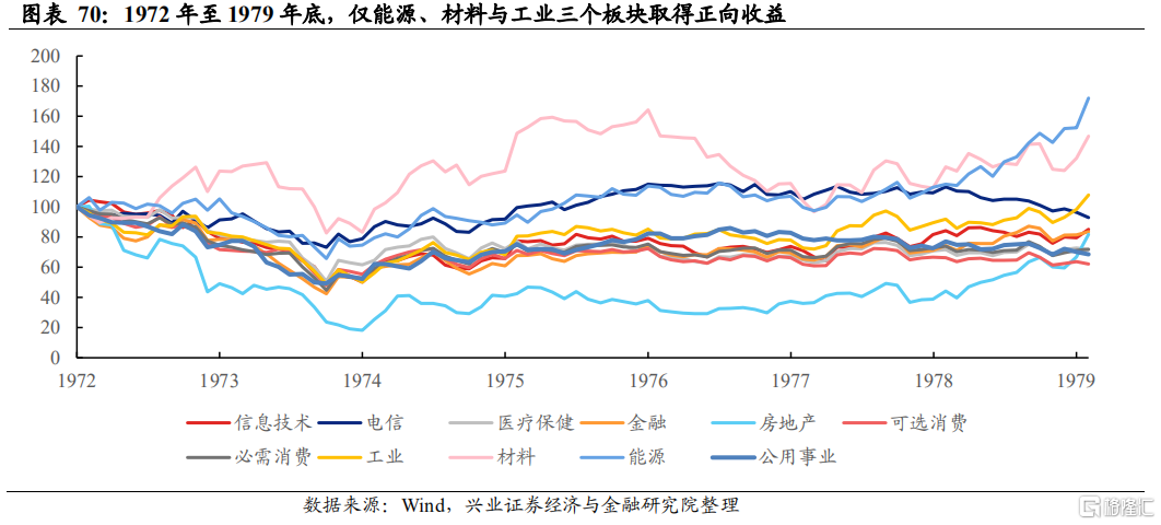 受益于大宗商品涨价的逻辑,周期行业的基本面有较强支撑,叠加其低估值所提供的更高的安全边际,更强劲分子端盈利与分母端更小的回撤使能源与材料板块领涨市场,截至1979年底,二者的涨幅为43.6%和40.7%。此外,工业行业也录得2.6%的涨幅,是70年代仅有的三个取得正向收益的一级行业。