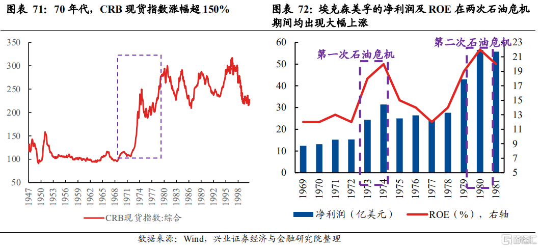 盈利方面,两次能源危机造成的通货膨胀属于成本推动型通货膨胀,叠加彼时美国下游需求相对较弱,偏上游的能源与材料企业提价能力更强,中游制造次之,下游偏弱,所以上周资源品行业的盈利涨幅比中下游行业更明显。以石油龙头(埃克森美孚)为例,不仅整个70年代公司的营收与净利润均呈现出稳定上升趋势,两次石油危机前后更是出现了剧烈的增长,其中企业净利润在两次危机爆发的当年更是录得50%的涨幅,明显高出增速中枢,表征了企业盈利极为受益商品价格的上涨。。