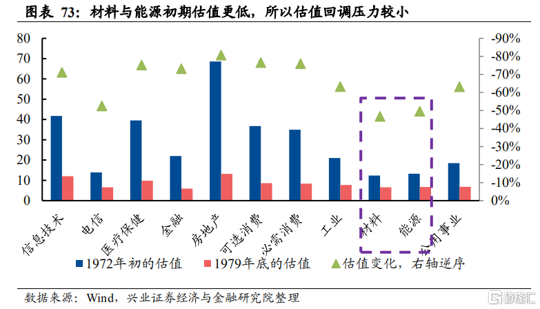 估值方面,由于能源与材料板块的PE在70年代初期排名靠后,叠加滞胀时期业绩确定性更强、更吸引投资者,所以能源与材料行业在70年代所遭受的“杀估值”幅度更小,分别为47%和50%,在所有行业中排名靠后。