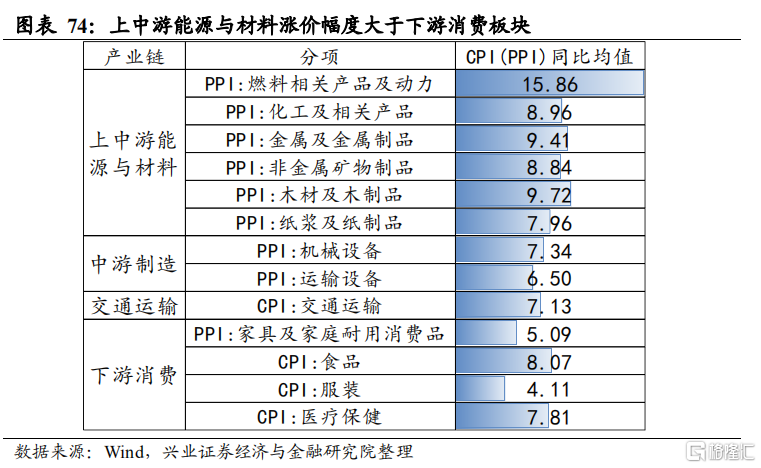 (1)价格传统机制不通畅:上中游能源与材料涨价幅度大于下游消费行业。70年代的通货膨胀是由外部黑天鹅事件冲击、使供给大幅收缩所造成的,属于成本推动型通胀,70年代美国的下游需求并不算很旺盛,所以偏下游的消费行业的涨价能力弱于上游能源和原材料行业,通过观察PPI和CPI分项同比之差,我们可以明显看出上游产品的涨价能力强于下游。