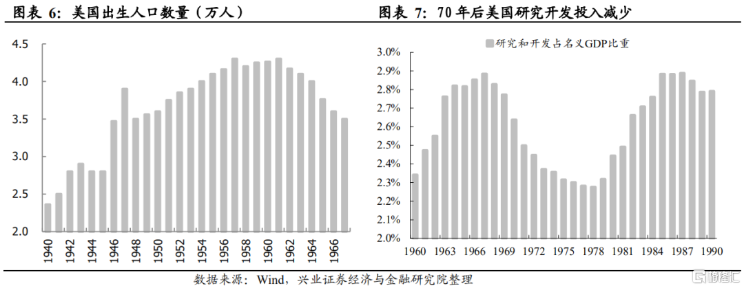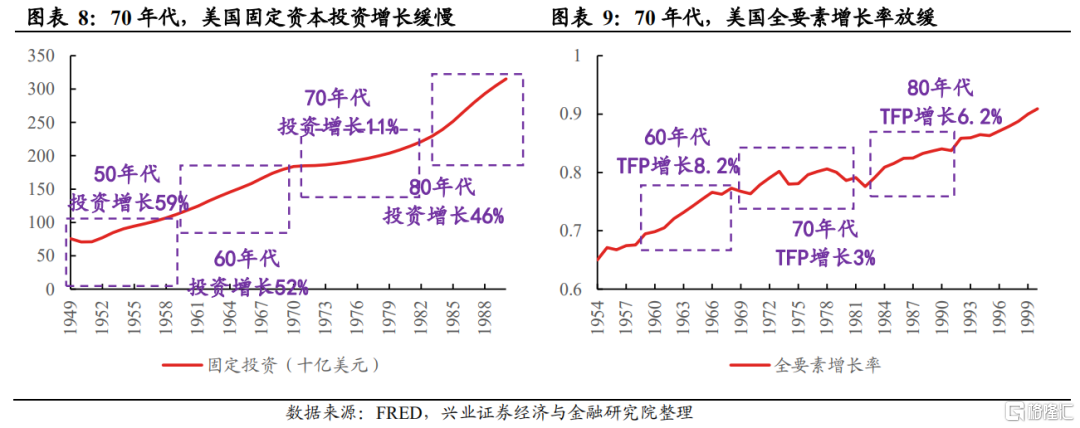 经济停滞乃至倒退的本质是投资和科技发展趋缓,70年代美国投资增速和全要素增长率增速较五六十年代大幅放缓。1)二战后,得益于马歇尔计划、滞后需求释放、婴儿潮及中产阶级成长等因素的支撑,美国经济一度高增速增长。尤其是对朝(1950-1953年)、越(美国参与的是1961-1973年,其中1965-1968年直接参战)两次战争叠加冷战背景,令美国始终保持着对军工品的旺盛需求,国防开支占GDP比重维持在高位,促进相关行业发展并成为拉动经济增长的重要力量。但到了60、70年代这些因素开始逐渐消失。整个1970年代,美国固定资产投资仅累计上涨11%,涨幅显著低于过去50%以上的水准。2)50、60年代,美苏围绕原子能技术、航天技术、电子计算机技术等高新技术展开竞争,开启人类第三次科技革命。但到了70 年代,以美国载人登月为标志,双方对于科技领域的投入开始减少,第三次科技革命的推动力阶段性减弱,十年间全要素增长率涨幅仅3%,显著低于50年代的18%和60年代的8.2%。