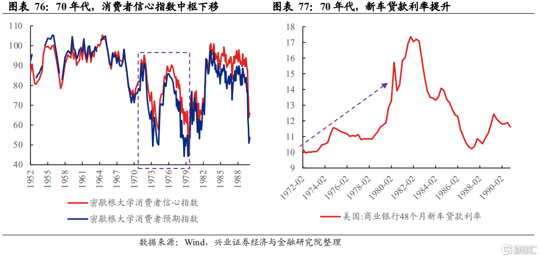 (2)居民消费边际降低:受消费意愿和能力降低的拖累,美国居民消费支出减少。一方面,尽管高通胀时期理应加大消费支出以减少货币贬值所带来的负面作用,但70年代除了“胀“还有“滞“,对于经济的不乐观预期削弱了人们的消费意愿,该时期,密歇根大学消费信心指数由80下行至61;另一方面,累进制税率下,通货膨胀降低了居民的实际收入,70年代美国居民人均可支配收入(不变价)累计增长23.5%,较60年代的37.5%大幅放缓。此外,通胀引发的高利率也不利于消费的增长,以可选消费中的汽车为例,该阶段商业银行的48个月新车贷款利率由10%升至16%左右,试想有多少人会以如此高的利率购买汽车呢?