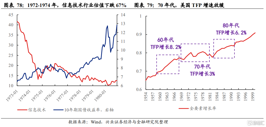 科技技术研发放缓,使信息技术板块基本面边际受损,叠加高利率环境对成长行业的高估值“不友好”,截至1979年底,信息技术板块下跌近24%。分母端,美国10年期国债收益率上行260bp至10.4%,流动性收紧使信息技术行业的估值下跌超70%(主要是1972-1974年熊市期间,PE下跌67%)。分子端,相比于60年代不断涌现出新的电子产品和80年代开启的个人PC时代,70年代是美国科技史上一个较为“尴尬”的时期,70年代全要素增长率涨幅仅3%,显著低于50年代的18%和60年代的8.2%。;此外,日本的崛起同样侵蚀了美国在电子领域的贸易份额,进一步削弱科技行业的基本面。