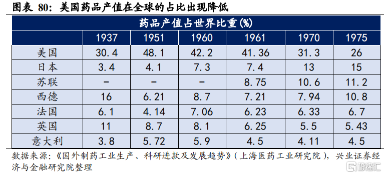 70年代政府加强对药物的限价,叠加日德等国家医药企业的崛起,美国医疗保健公司盈利能力受损,拖累行业下跌26.1%。分子端,1970年,尼克松上台后推出了《稳定法案》(EconomicStabilization Act of 1970)以实行价格和工资管制,据Coele和Sullivan的研究,这项法案严重挫伤行业内企业的利润空间;1972年,美国政府宣布废弃369种药品,进一步减少了药企的营收来源。此外,随着日本和德国经济和技术竞争力的提升,美国药企面临较大的挑战、市场份额出现下滑,美国药品产值占世界总产值的比重由1970年的31.3%下滑至1975年的26%。分母端,类似于科技股的逻辑,流动性收紧时期,估值处于高位的医疗股面临较大的回调压力。