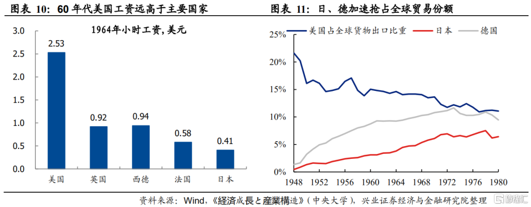 日、德完成产业转型,加速抢占全球贸易份额,进一步削弱美国经济增长动能。70年代,日本形成了以汽车、半导体等“高精尖”板块为核心的产业格局,并凭借高性价比逐步蚕食美国出口份额。1970年至1980年间,日本出口金额增速长期高于美国,由190亿美元上涨720%至1300亿美元,累计涨幅更是超出同期美国出口2倍以上。以汽车产业为例,汽油消耗低的日产汽车受到了全球消费者青睐,据纽约时报消息,70年代日本汽车出口翻了5倍至600万辆。激增的需求拉动日本汽车产量实现翻倍,而同期的美国汽车产量却零增长,此消彼长的结果即是日本于1978年取代美国成为世界头号汽车生产国。此外,该时期的美国出口金额增速显著低于进口,贸易顺差逐渐收窄、之后甚至转变为360亿美元的逆差。