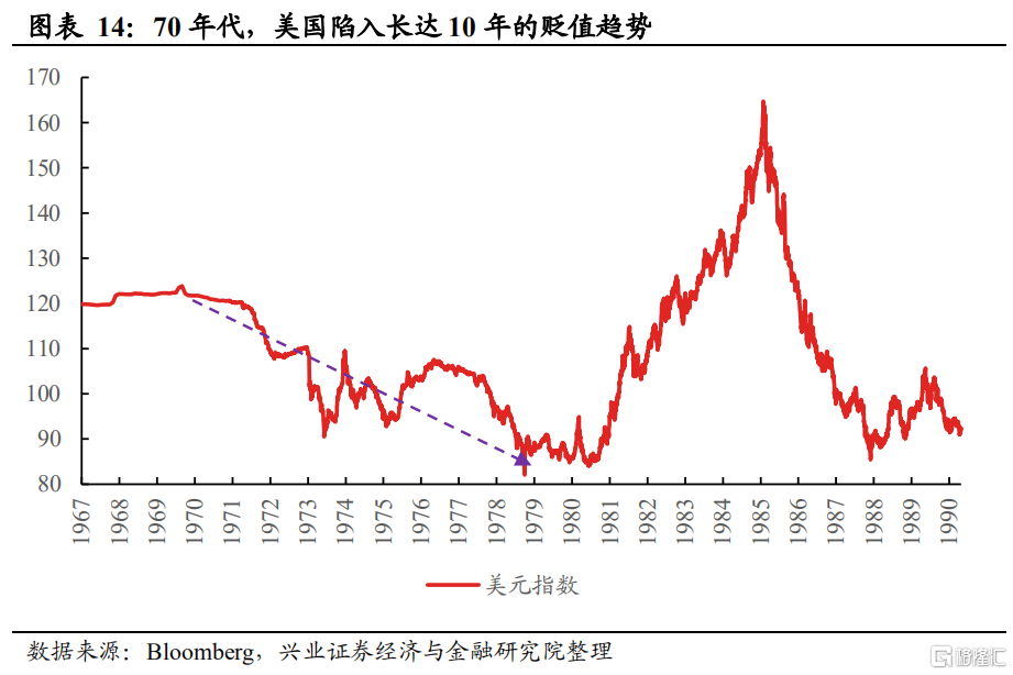 (1)随着美国贸易份额缩减、国际收支趋向恶化,全球出现了“美元过剩”情况,各国纷纷抛出美元兑换黄金,美国黄金开始大量外流。大量黄金储备流失导致美元对外信用保证不足,对内持续贬值。该危机同时逼迫尼克松放弃美元的金本位制度,布雷顿森林体系告终。截止1979年底,美元指数由121.7下降30%至85.8。