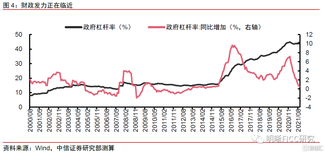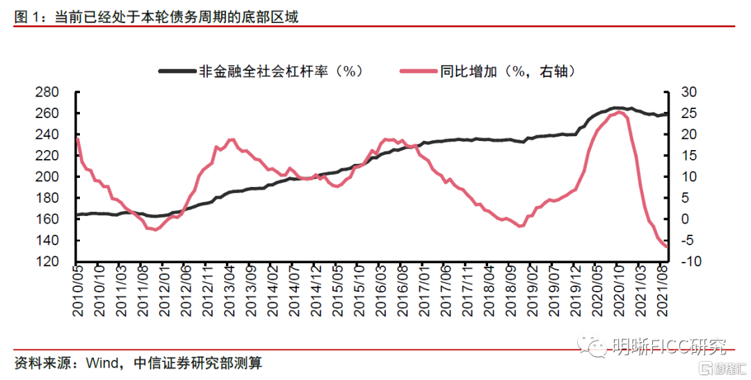 本轮债务周期底部大概率出现在今年底,9月份可能是年内宏观杠杆率同比的最低点,但是杠杆率绝对值的低点可能在年底。分项来看:1)社融增速四季度可能企稳回升。8·23央行货币信贷形势分析座谈会首提“增强信贷总量增长的稳定性”,显示政策层已经将稳定信贷增速的考量提上日程,再加上年底专项债发行提速对社融的支撑,以及近期部分地区房地产政策的边际放松,都可能助力社融增速的企稳回升;2)四季度实际GDP增速可能较三季度环比改善。三季度经济受到极端天气、疫情反复和限电限产的多重冲击,其中部分因素有望在四季度边际改善,叠加近期地产和信贷相关政策的边际放松,四季度经济增长可能较三季度出现改善;3)四季度通胀水平在商品供应紧缺的背景下可能仍然居高不下,PPI可能向CPI传导。