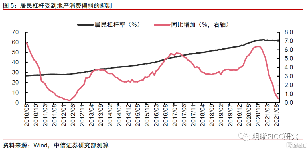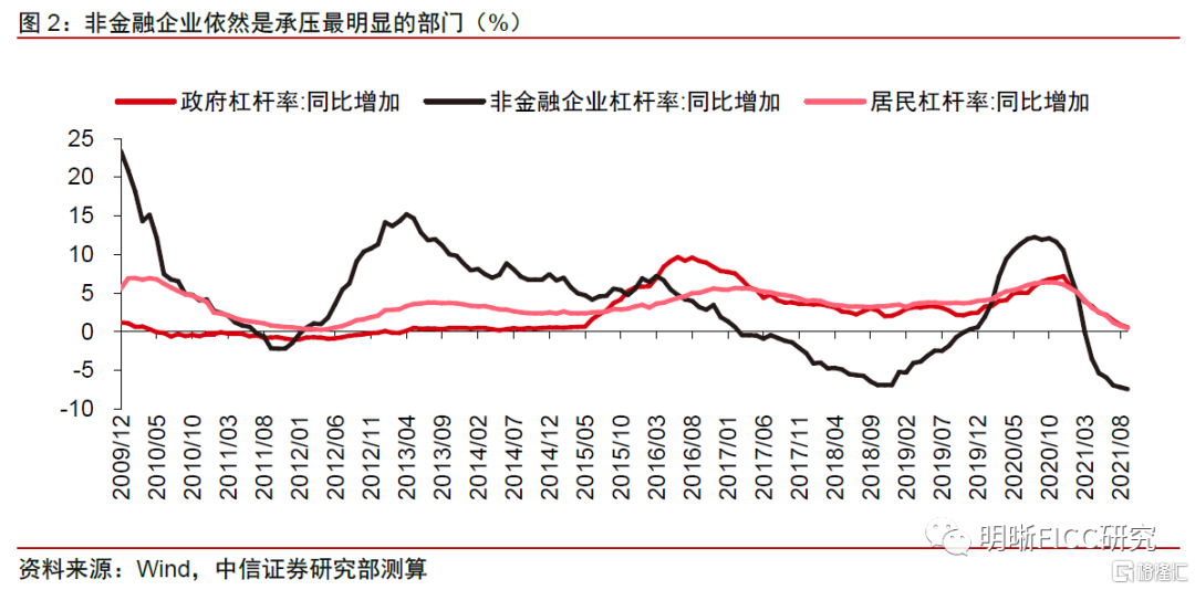 分部门来看,预计9月政府/居民/非金融企业部门杠杆率环比变化0.4/0.2/-0.4个百分点,企业部门是宏观杠杆率的主要拖累项。政府部门杠杆率在年底专项债供给放量的背景下有所抬升,成为社融和杠杆率的主要支撑项,金融数据的结构体现出逆周期特征有所增强。居民部门方面,9月30大中城市商品房成交面积进一步下滑,带动住户贷款继续偏弱。企业部门方面,9月各地限电限产对供求两方面均造成冲击,企业融资需求受到抑制,杠杆率下行幅度也最高。虽然9月份社融增速(10%)是今年以来最低,但三季度实际GDP增速回落幅度更大(至4.9%),即便有高通胀的支撑(9月PPI 10.7%),我们也看到宏观杠杆率回落的幅度已经远小于上半年。