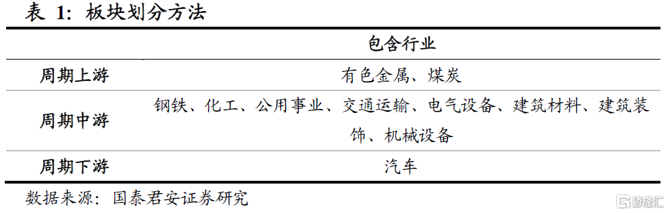 我们将周期板块细分为上、中、下游三个子板块,每个子板块内的行业等权加总构成板块指数。